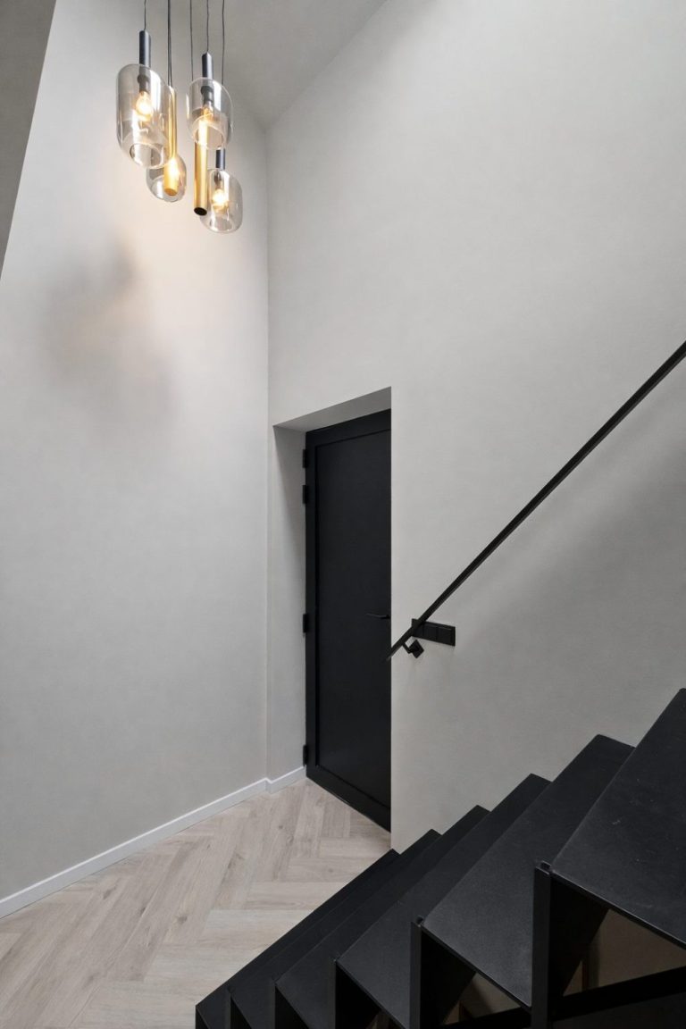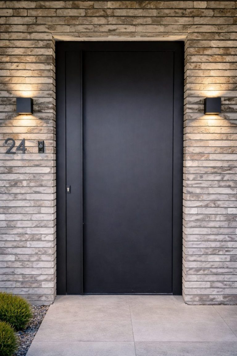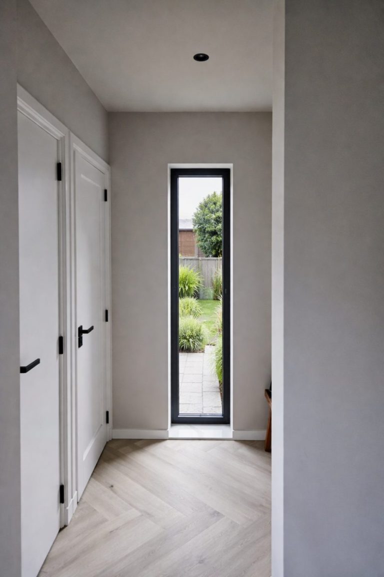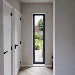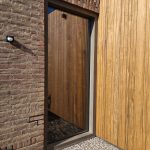 Ook de voordeur sluit hier naadloos op aan. Er is gekozen voor een superstrakke plano voordeur, volledig vlak uitgevoerd en perfect passend bij de moderne stijl van de kozijnen en de rest van de woning.