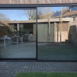 Aan de achterzijde van de woning is een nieuwe aanbouw gerealiseerd. Hier heeft de klant gekozen voor aluminium kozijnen in combinatie met een grote aluminium schuifpui met een zo smal mogelijk aanzicht.