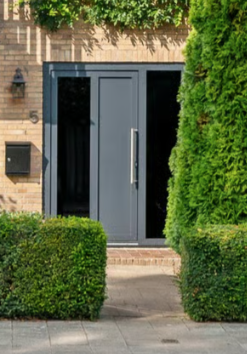 Voordeur: Strakke aluminium voordeur met Dark Glas voor een exclusieve uitstraling en het voordeel is dat niemand direct naar binnen kijkt.